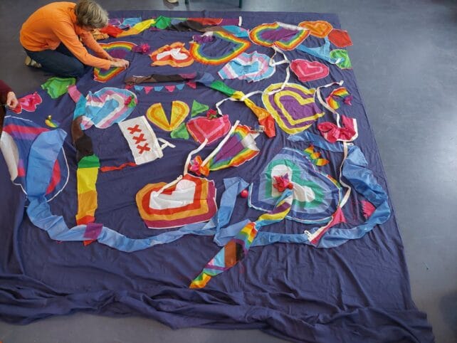 Gestart in het vrouwenweekend gaan we verder met naaien van stukken doek van de Pride2025 om een gezamenlijk kleed te maken!
